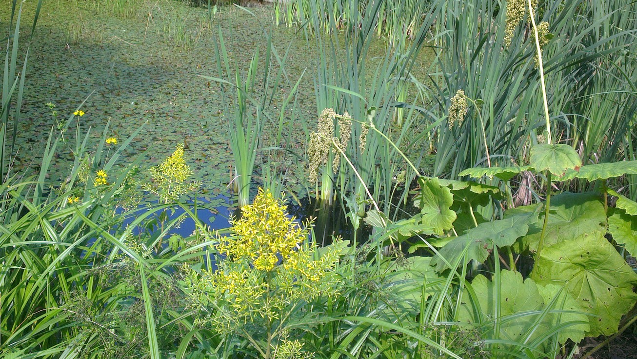 I jeszcze te dwie rośliny, rosły na skraju stawu, nogi miały w przybrzeżnym błotku (na pierwszym planie żółto kwitnąca i na prawo ta z dużymi liśćmi).