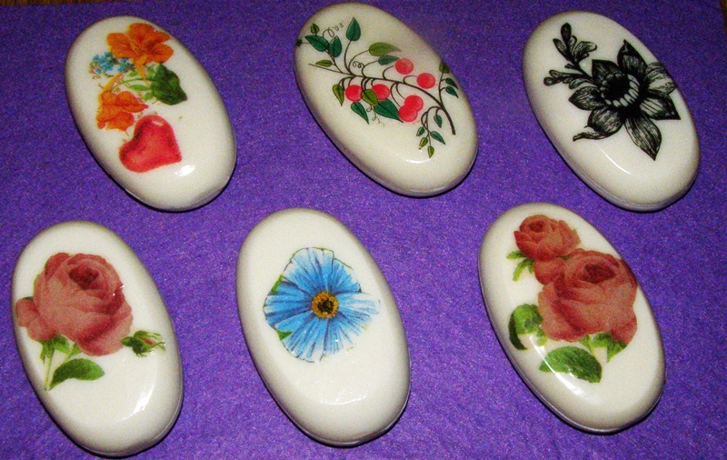 Tak właśnie Cebulko, lakierujesz tylko obrazek :) Każda z Was może sobie takie mydełko zrobić :) . Kupujesz mydełko, (musi być białe), tarką-nożykiem do sera, trzeba pozbyć się logo mydełka" nivea" np.... . Później papierem ściernym (może być pumeks drobny) wygładzić mydełko. Posmarować klejem do decoupage lub wikolem do drewna ( sprawdzona metoda). Poczekać aż wyschnie, przyłożyć dowolny wzór z serwetki ( tylko tę warstwę z rysunkiem, pozostałe białe warstwy serwetki wyrzucamy), posmarować klejem ( tzn wierzch serwetki smarujemy klejem) czekamy aż wyschnie ( nie żałujemy kleju, obrazek będzie biały, ale jak wyschnie zrobi się znów widoczny i nabierze kolorów :) ) i 2-3 razy smarujemy lakierem wodnym, ale każda warstwa lakieru musi porządnie wyschnąć i gotowe :)