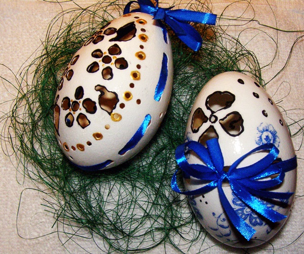 Urządzenie nazywa się Dremel, wygląda jak mała wiertarka, do tego są wymienne frezy z końcówkami "diamentowymi" o różnych kształtach, rysujesz na jajku wzorek ( albo z głowy) i lecisz ;) . To tylko trzeba się odważyć, a później jakoś leci. ;) Pyli niestety i jak wydmuszki są świeże to niestety i zapaszek taki nieteges ;) .