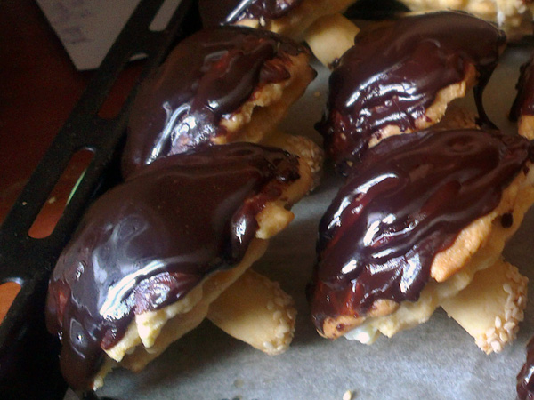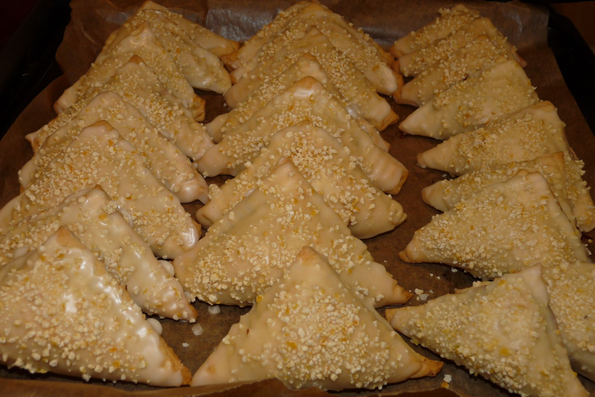 Pod spodem wklejam oryginalny przepis (z Wielkiego Żarcia bodajże, pierwszy z brzegu co wyskoczył). Właściwie się go trzymałam, miałam prawie kilo drożdżowego podeschniętego ciasta i pół paczki herbatników, do tego rodzynki, cukru prawie nie dałam, masła trochę mniej, nie dałam kakao ani Nutelli, za to zrobiłam porządek w dżemach w lodówce, więc w ciachach było trochę śliwkowego, malinowego, kwaśnego winogronowego i co najwspanialsze - łyżka Szelkowych płatków różanych