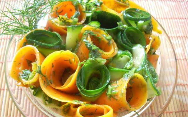 Składniki: 2 spore marchewki, 1 nieduża cukinia, 3-4 łyżki oliwy z oliwek, 1-2 łyżki soku z cytryny, 1 łyżeczka cukru (połowa do sosu, reszta do gotowania), 1/2 łyżeczki soli, 1 łyżka posiekanego koperku, do smaku: szczypta soli i mielonego pieprzu.