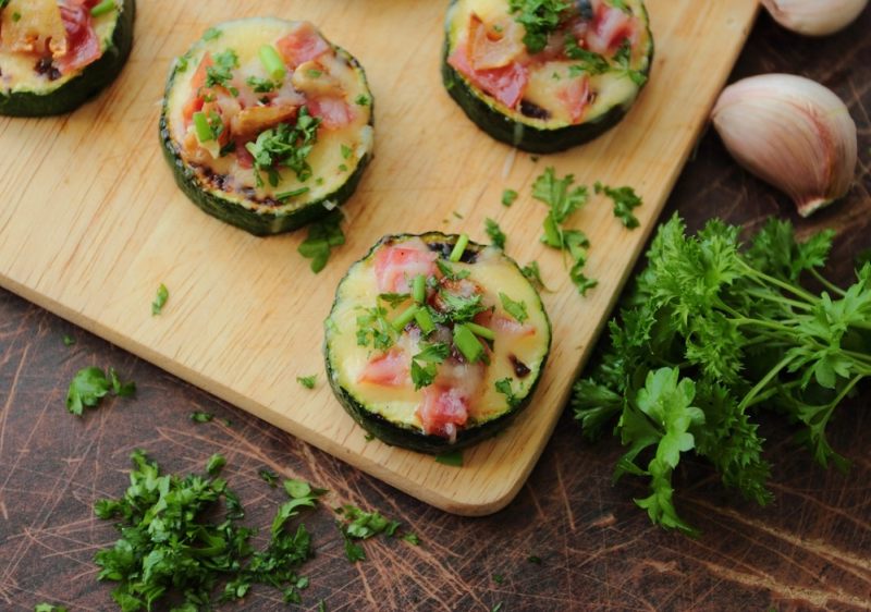 Składniki: 2 większe cukinie, 150 g sera żółtego gouda, 2 ząbki czosnku, natka pietruszki, 100 g boczku wędzonego, oliwa z oliwek.